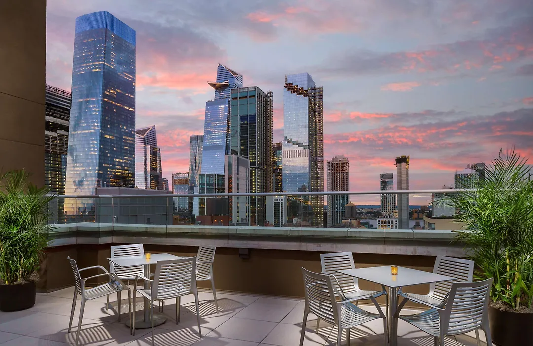 Leisure facilities include a rooftop bar overlooking the New York City skyline. The fitness center is available for guests looking to maintain their workout routine.
