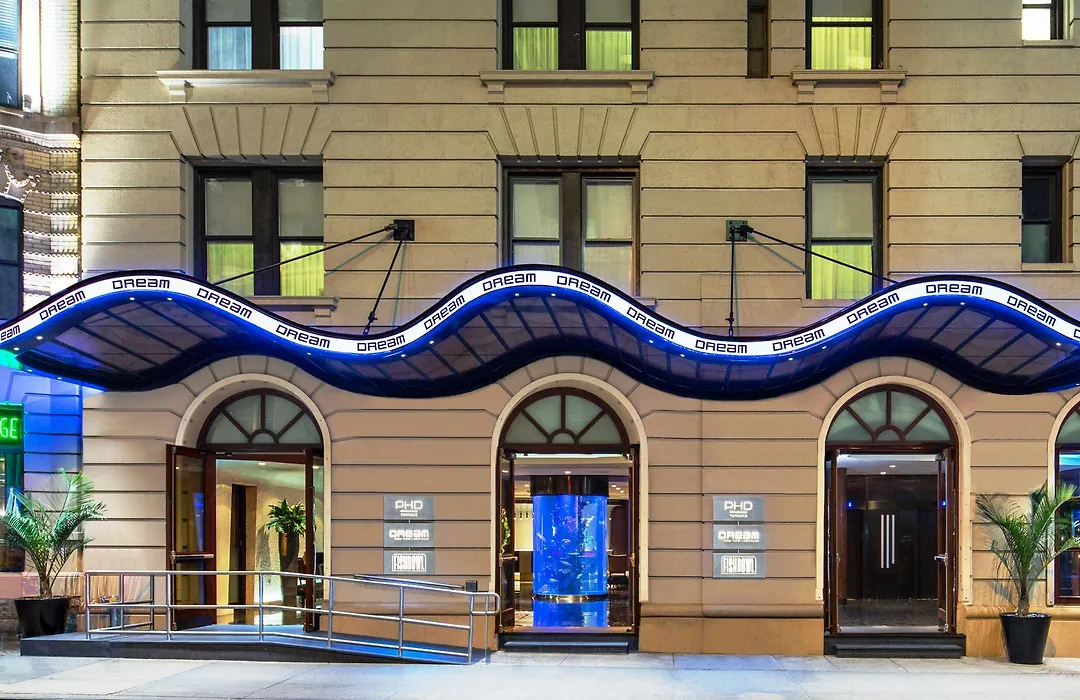 Dream Midtown features unique spaces like Fishbowl, an upscale game room with a 5000-gallon fish tank, providing a spot to watch sports or relax with beverages. The design includes polished-mirror walls and vibrant artwork, creating a lively atmosphere. The hotel also emphasizes accessibility for guests with disabilities.