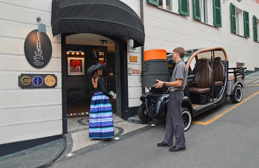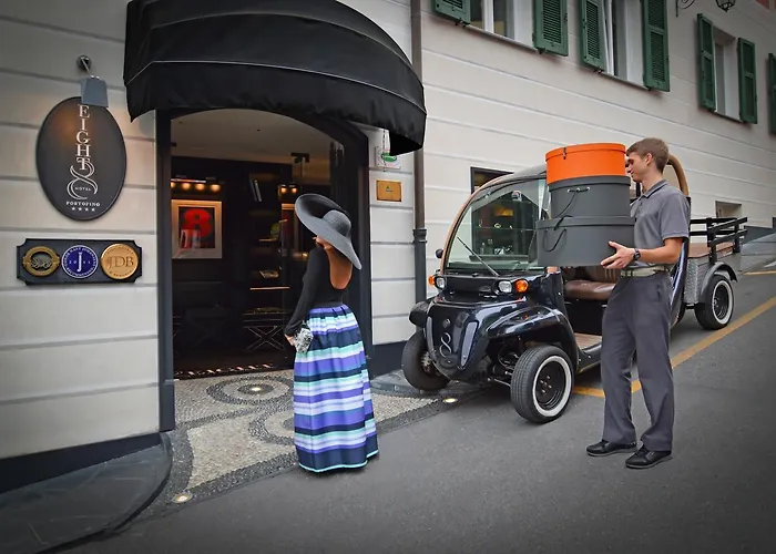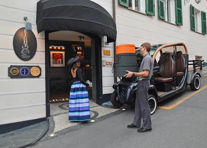 Eight Hotel Portofino, a 5-star hotel with an 8.8/10 rating on Booking.com, features luxurious accommodations and a private garden ideal for leisurely relaxation. This Portofino hotel caters to both personal retreats and professional gatherings, with amenities including a spa and outdoor hot tub.