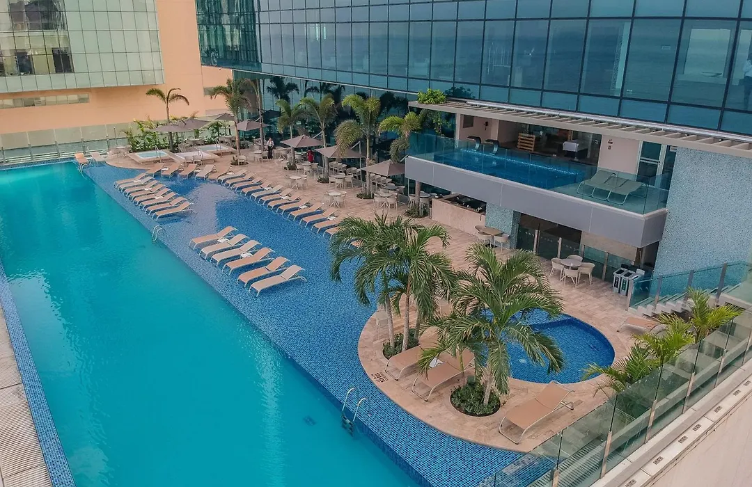 Estelar Cartagena De Indias Hotel Y Centro De Convenciones features an infinity pool with ocean views, a full-service spa, and a rooftop bar at 51 floors. This 5-star Cartagena hotel offers 339 rooms, including a range of family-friendly and pet-friendly accommodations, all with air conditioning and complimentary Wi-Fi.