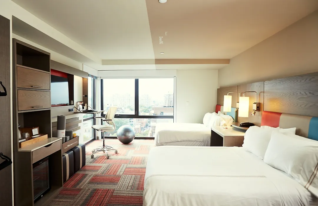 The wellness rooms at Even Hotel Brooklyn By Ihg feature natural light, flexible workspaces, and dedicated in-room fitness zones that include fitness kits and revitalizing showers. Guests can expect 40-inch HDTVs, free Wi-Fi, and eucalyptus linens for a refreshing sleep experience.
