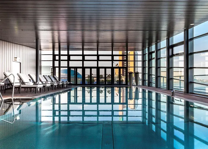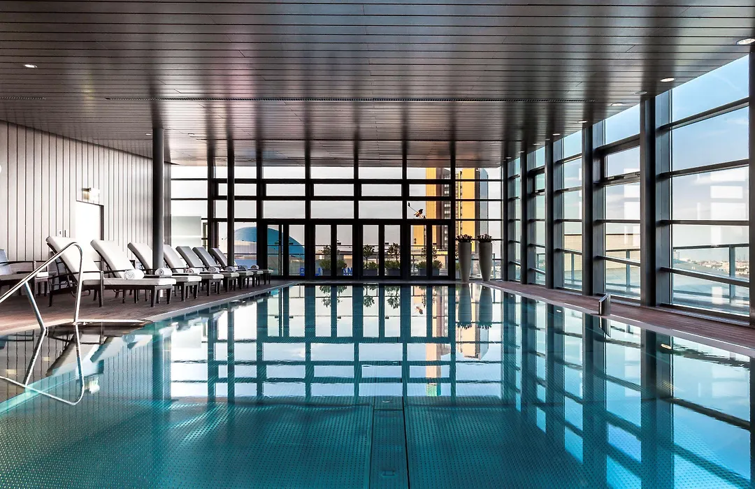 Leisure facilities include a Club Olympus Spa & Fitness with skyline views, an indoor swimming pool, and various saunas. The hotel's environment is enhanced by contemporary art installations, including sculptures by renowned artists.