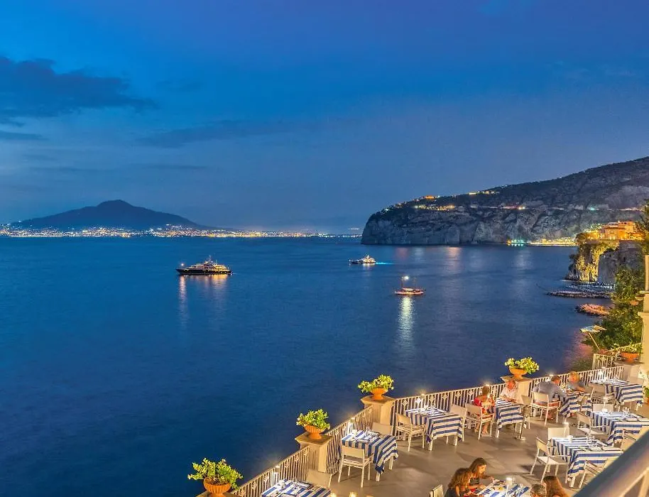 Grand Hotel Riviera offers a 4-star luxurious experience with panoramic views of the Gulf of Naples. The hotel features a private beach, three onsite restaurants, and extensive gardens. It is rated 9.1/10 on Booking.com.