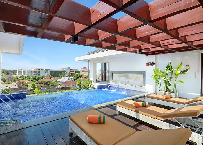 The hotel features four pools, including a rooftop pool with views over Seminyak and a separate children's pool. Rooms are brightly decorated and equipped with a flat-screen cable TV, safety deposit box, and air conditioning. Certain rooms include a seating area for relaxation.