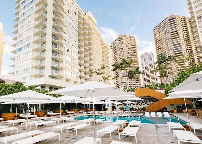 The hotel features a fitness center, outdoor pool, and activities such as hula lessons and morning yoga. Nearby attractions include Magic Island, Honolulu Zoo, and Ala Moana Center, providing options for exploration and enjoyment.