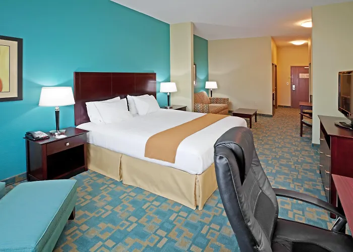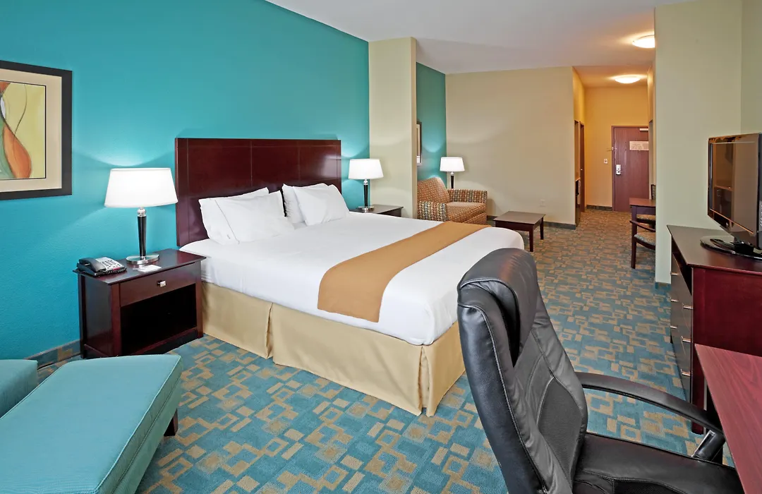 Rooms at Holiday Inn Express feature modern amenities including a microwave, refrigerator, Keurig coffee maker, and 40" flat-panel TV. Each room is equipped with USB outlets, in-room safe, and a plush duvet for a restful stay. Selected suites offer additional space with a sofa sleeper and wet bar.