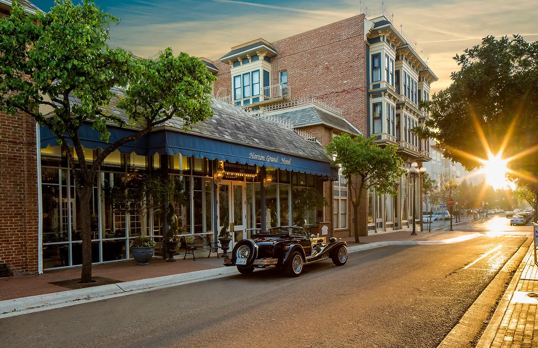 Rooms at Horton Grand Hotel reflect the grandeur of the 1880s, featuring handcrafted antique furniture, marble-framed gas fireplaces, and modern luxury amenities. Guests can choose between rooms with city or courtyard views, and select rooms are pet-friendly for a fee.