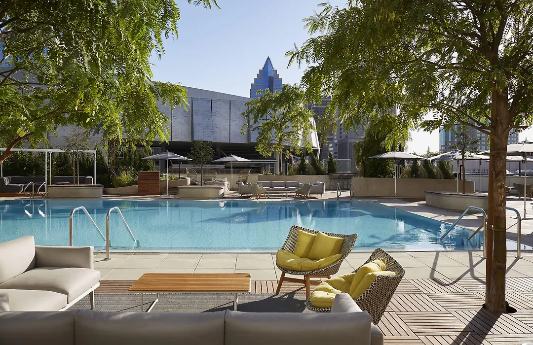 Guests at Kimpton Sawyer Hotel can relax by the rooftop pool while enjoying panoramic views of Downtown Commons. The hotel also hosts live music events in the lobby and offers wellness amenities, including yoga classes and treatments by Trü Encompass Beauty. Complimentary public bikes are available for exploring the city.