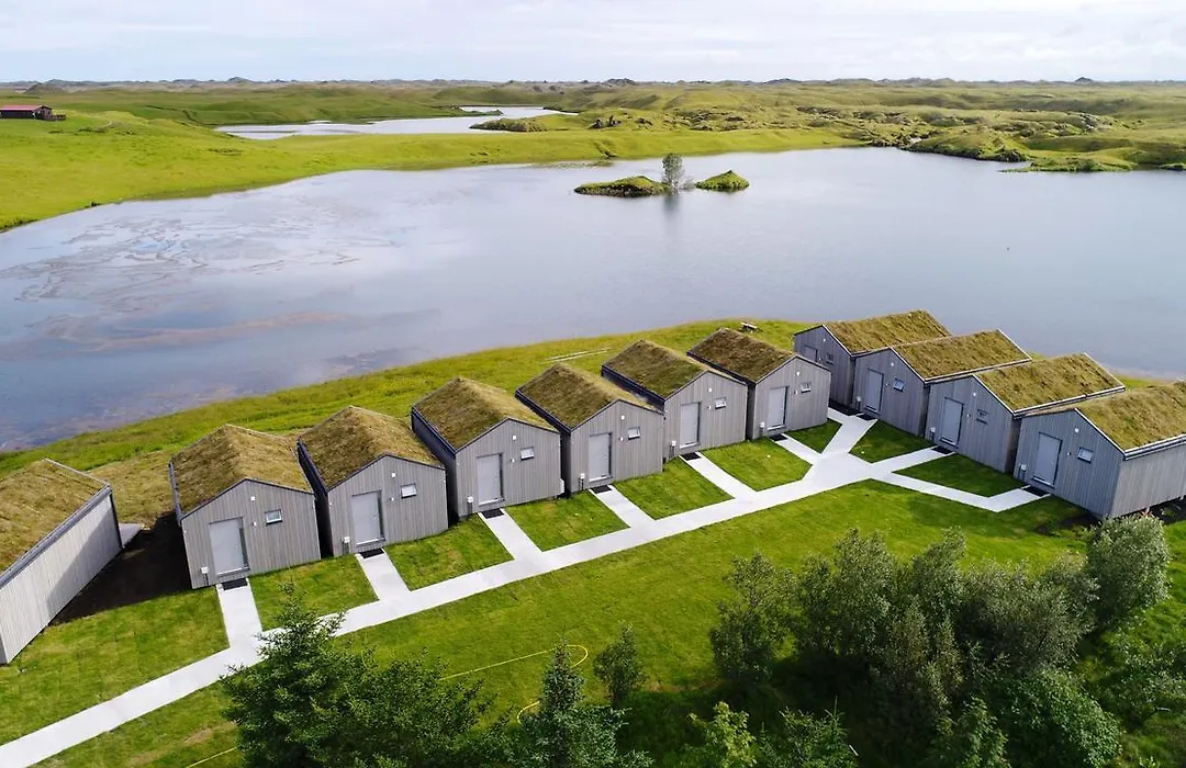 The hotel offers 25 rooms, including standard, deluxe, and family options designed with modern Nordic decor. Each room boasts private patios with views of the surrounding lake and lava fields, and includes free high-speed Wi-Fi and flat-screen TVs with Netflix access.