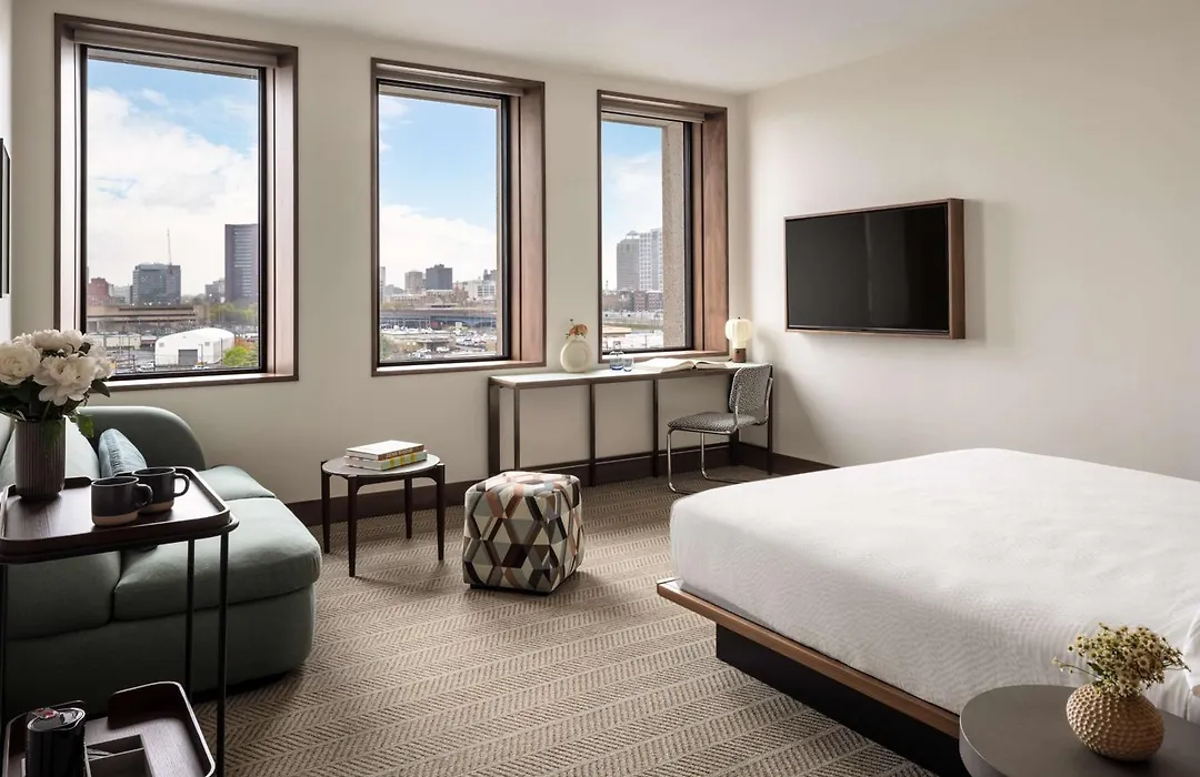 The hotel features 165 rooms equipped with premium bedding, laptop-friendly workspaces, flat-screen TVs, and complimentary WiFi. Each room includes thoughtful amenities such as a mini-fridge, coffee and tea facilities, and private bathrooms with free toiletries.