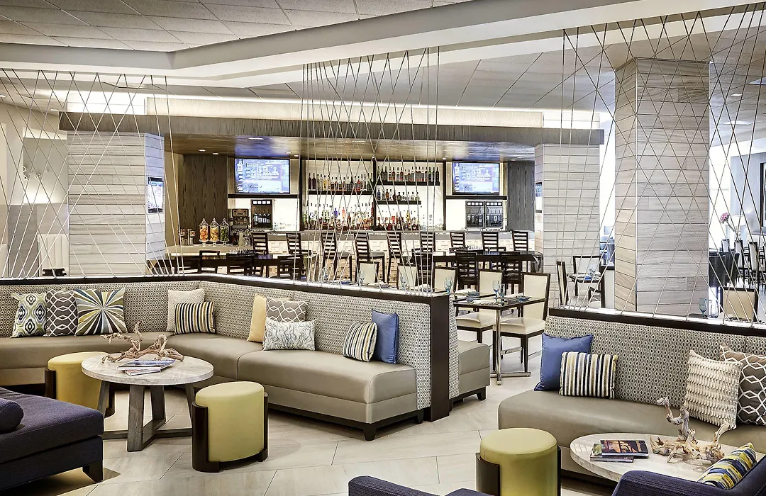 Dining options at the hotel include the FLOE Lounge, which serves California cuisine for breakfast and lunch, along with craft cocktails. Guests can also enjoy in-room dining or snacks from the Hot Shoppes, offering Starbucks coffee and quick meals.