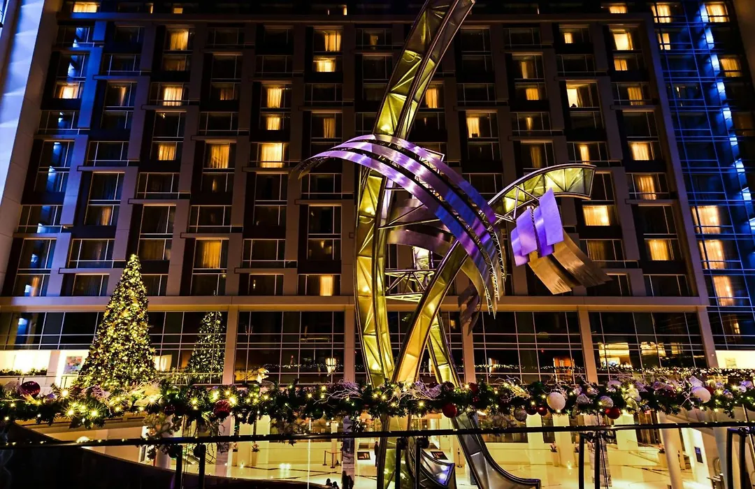 The hotel features a 24-hour fitness center with leading-edge equipment and multiple dining outlets. The Lobby captures depth with a stunning sun-filled white marble atrium and a custom 55-foot sculpture, providing an inviting environment for relaxation and socializing.