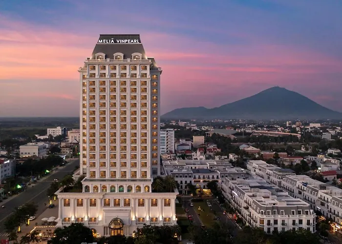 Meliá Vinpearl Tay Ninh, a 5-star hotel with a rating of 9.1/10 on Booking.com, features contemporary architecture and luxurious facilities including an indoor pool and spa services. This Tây Ninh hotel offers exquisite dining options at its fusion restaurants and stylishly designed rooms with mountain views.