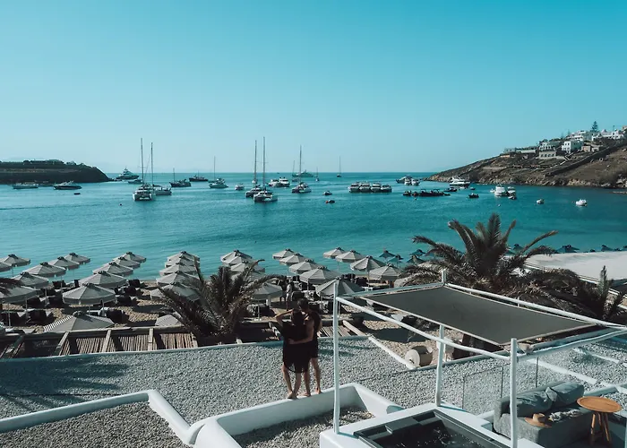 Mykonos Ammos Hotel is a short distance from the Mykonos Island National Airport, enhancing accessibility. Nearby landmarks include Nammos Village and Paralia Psarou, while a public bus stop is located 13 minutes away on foot for further convenience.
