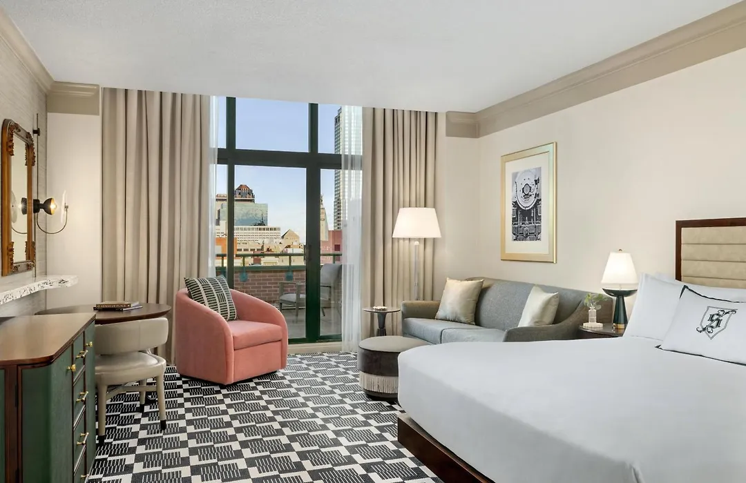 The hotel features 424 guest rooms and 36 suites equipped with modern conveniences, including luxurious linens, flat-screen TVs, and views of the downtown skyline. Suites offer additional space with private balconies and separate living areas.