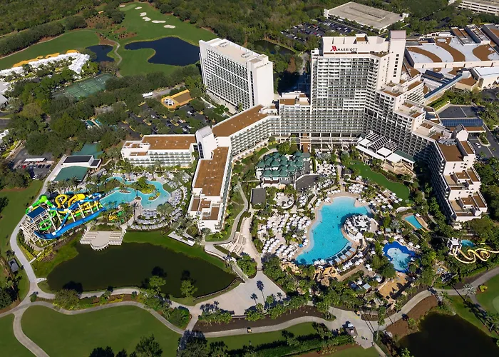 Orlando World Center Marriott, a 4-star hotel rated 8.4/10 on Booking.com, features a vast waterpark, multiple dining options, and extensive event facilities, making it suitable for families and business travelers. Notable amenities include a championship golf course and a full-service spa.
