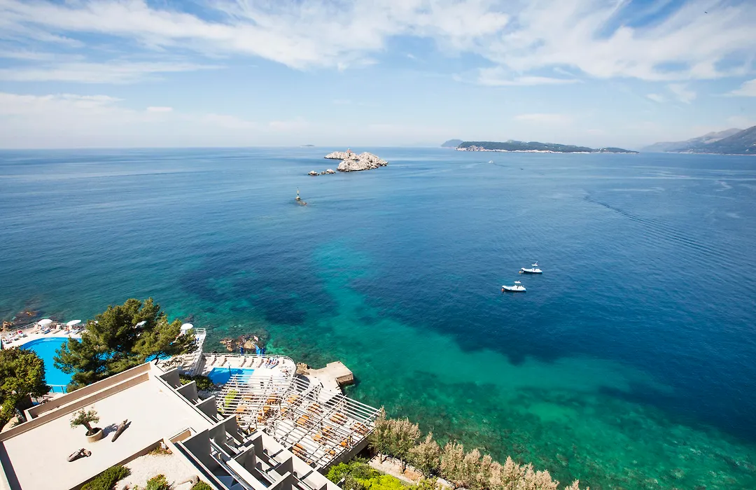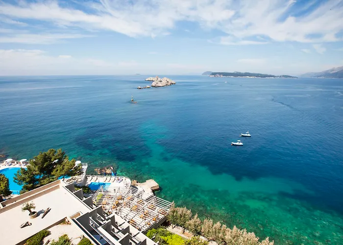 Hotel Dubrovnik Palace, a 5-star hotel with a 9.0/10 rating on Booking.com, features direct access to a quiet beach, two outdoor pools, and an indoor pool. The modern luxury resort situated between a pine forest and the turquoise coastal waters offers stunning views of the Adriatic Sea and the Elaphite Islands.