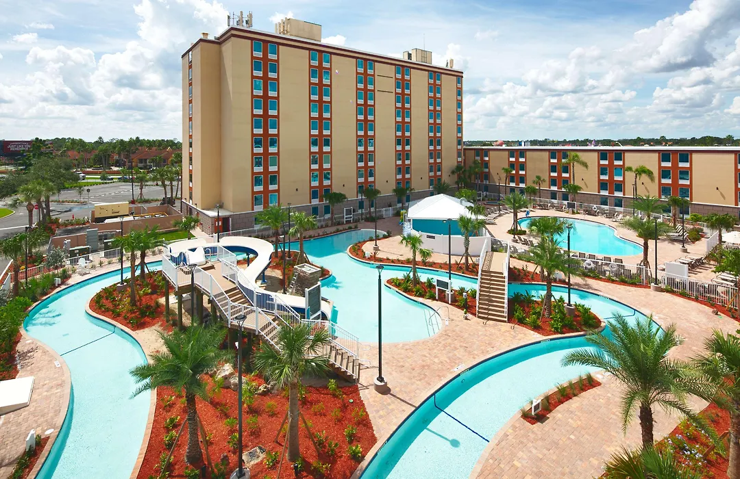 Red Lion Hotel Orlando Lake Buena Vista South- Near Disney is a 3-star, family-friendly hotel with a rating of 8.4/10 on Booking.com. The hotel features a huge heated pool, a lazy river, and multiple dining options, making it well-suited for guests visiting nearby theme parks.