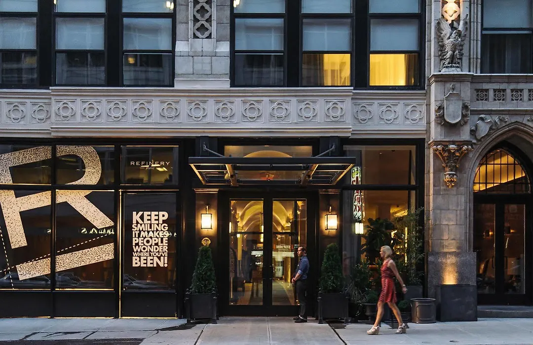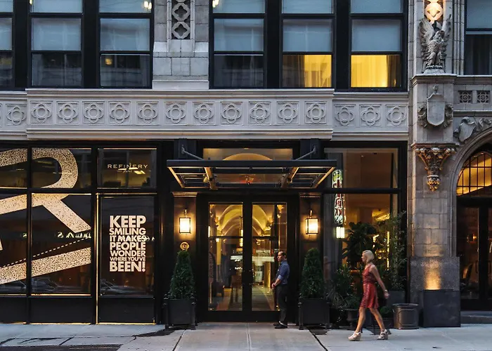 Refinery Hotel - New York is a 5-star hotel combining Garment District history with modern amenities. The hotel features a rooftop bar known for skyline views, a signature restaurant offering locally-sourced ingredients, and guest rooms designed with industrial accents. Rated 8.5/10 on Booking.com.