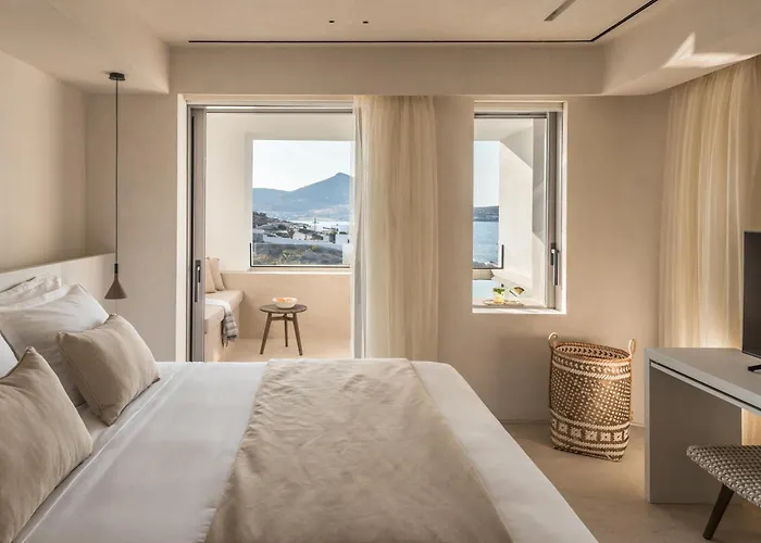 Hotel Senia - Onar Hotels Collection offers spectacular views of Naoussa Bay, luxurious premium rooms, and various amenities including two infinity pools and spa facilities. This 4-star Naoussa hotel enhances the essence of local craftsmanship with Cycladic design, situated just steps from Piperi Beach.