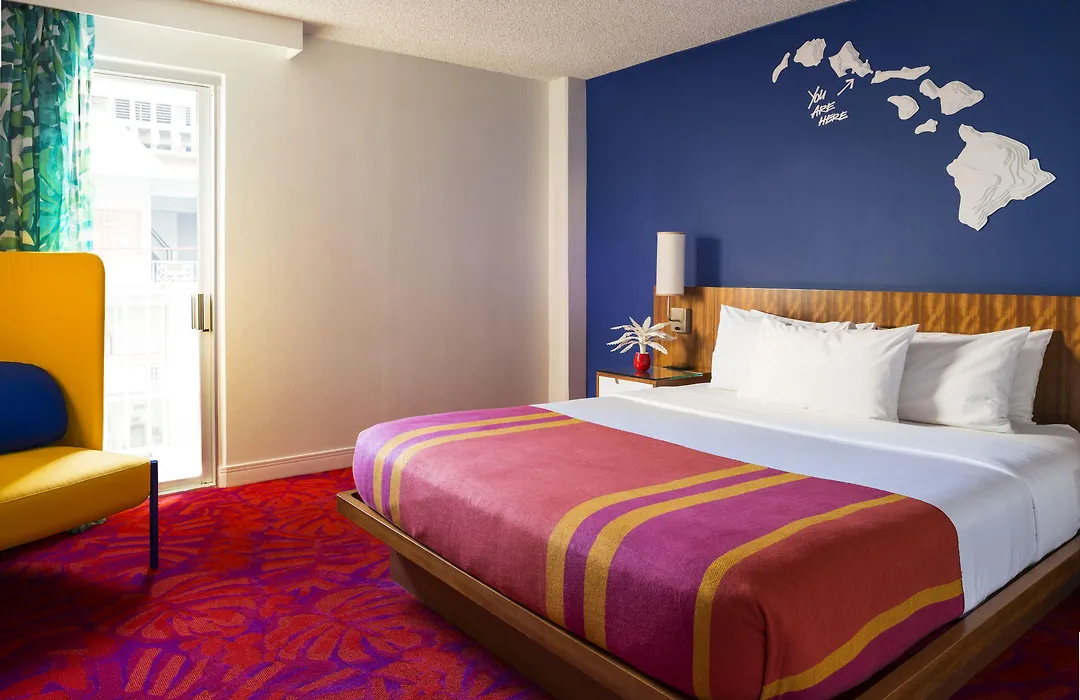 The hotel features a rooftop pool accented with original murals and offers various areas for relaxation. Guests are encouraged to explore nearby attractions, including Waikiki Beach just two blocks away, and the International Market Place with over 100 curated stores.