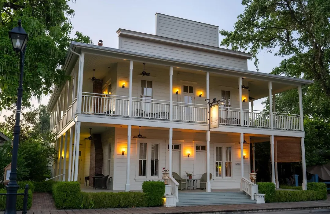 The Blue Wing Saloon, adjacent to the hotel, serves gourmet pub fare and a selection of locally produced wines. Al fresco dining is available on the tree-shaded patio during warmer months, and live music events regularly enhance the dining experience.