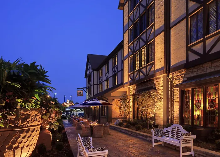 The Cheshire, a 4-star Richmond Heights hotel with a 7.7/10 Booking.com rating, features charming Tudor architecture and a variety of unique accommodations inspired by British literature. Guests can enjoy on-site dining options and a sleek wellness center. Noteworthy facilities include a seasonal outdoor pool and event spaces for various occasions.
