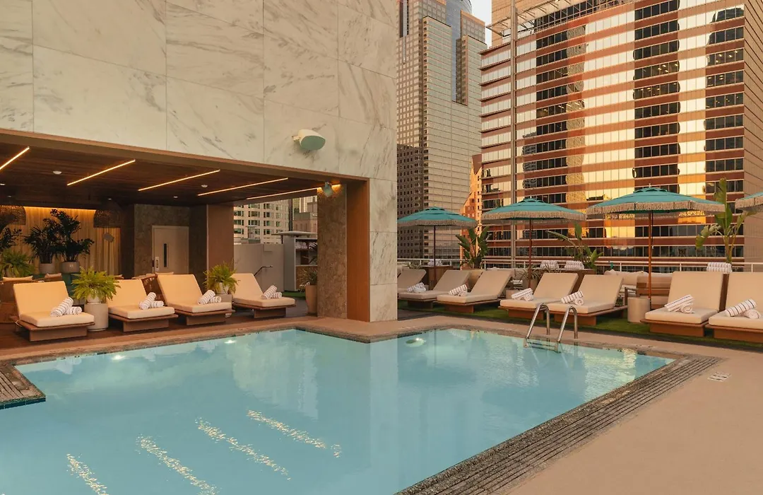 The Delphi Downtown La, a 4-star hotel rated 8.2/10 on Booking.com, features modern rooms and a rooftop pool. This minimalistic hotel is located in the Financial District and offers amenities such as a 24-hour restaurant and garden bar.