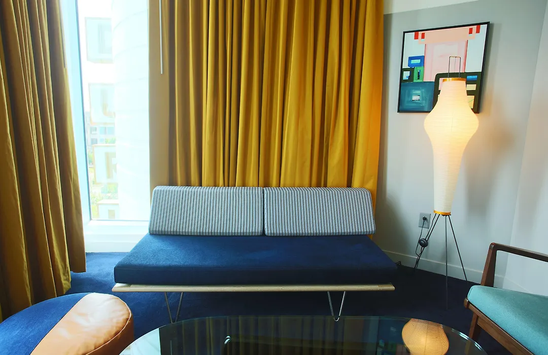 Guest rooms at The Durham Hotel feature modern interiors with platform beds, retro light fixtures, and plush amenities like custom blankets from Raleigh Denim. Additional comforts include in-room Counter Culture Coffee service, snack trays with North Carolina products, and zero-waste bath products.