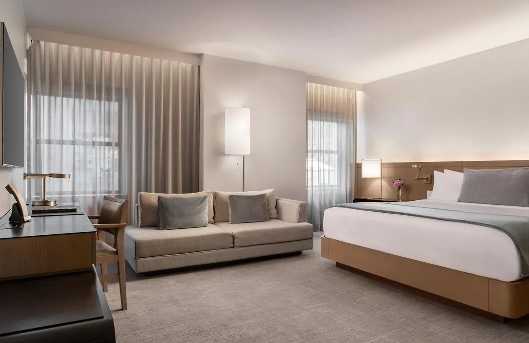 Dining options include Charlie Palmer Steak IV, offering prime cuts and market-driven sides, and the St Cloud Rooftop Bar, known for its crafted cocktails and stunning views of Times Square. Akoya, a hidden gem sushi bar, offers an authentic temaki experience led by Chef Taishi Yamaguchi.