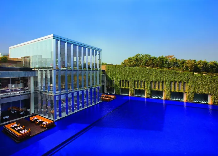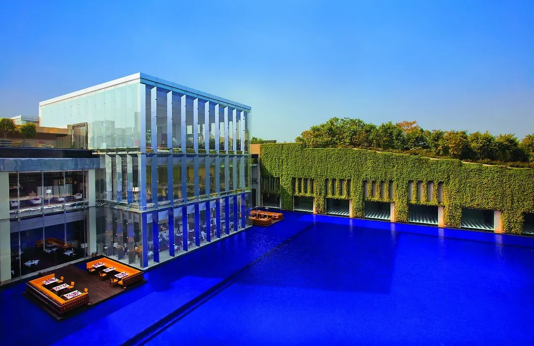 The Oberoi Gurgaon, a five-star hotel with a Booking.com rating of 9.5/10, serves as an urban sanctuary offering spacious accommodations and a range of modern amenities including a large outdoor pool, a spa, and electric vehicle charging stations.