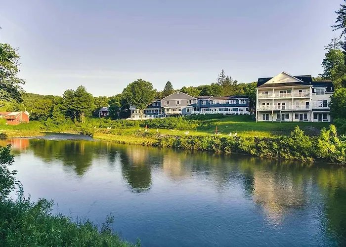 The Shire Woodstock is an 8.5/10 rated 3-star hotel offering family-friendly accommodations with traditional New England furnishings. Amenities include a garden, free parking, and riverside seating with views of the scenic Ottauquechee River.