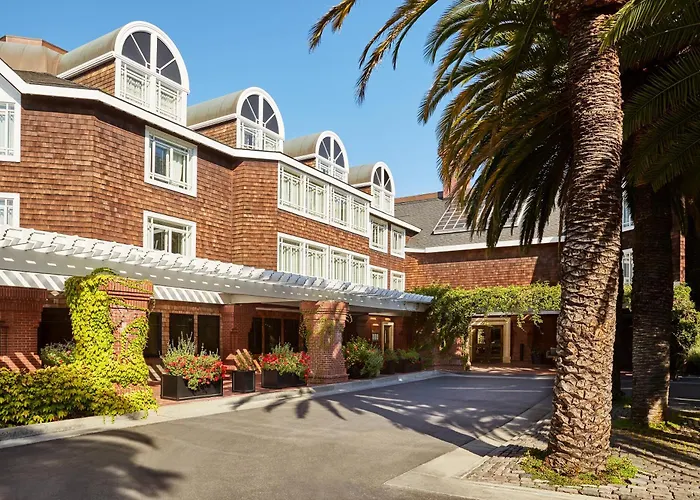 The Stanford Park Hotel, a 4-star Menlo Park hotel with a rating of 9.3/10 on Booking.com, features well-manicured grounds and classic architecture inspired by Maybeck Morgan design. This family-owned property includes a heated outdoor pool, a 24-hour fitness center, and an on-site restaurant, Menlo Tavern.