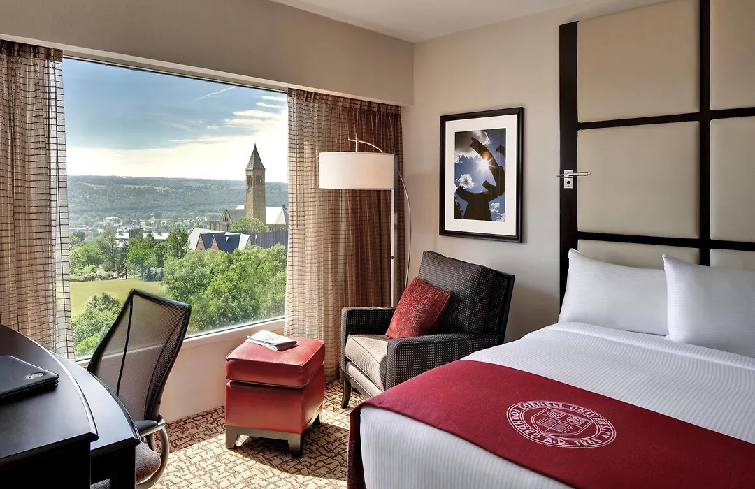 Guestrooms at The Statler Hotel feature contemporary designs and cozy amenities including plush pillow-top mattresses, LCD televisions, in-room refrigerators, and Starbucks coffee makers. Cornell Campus Suites provide additional space with separate sitting areas and frosted French doors, accommodating up to four guests.