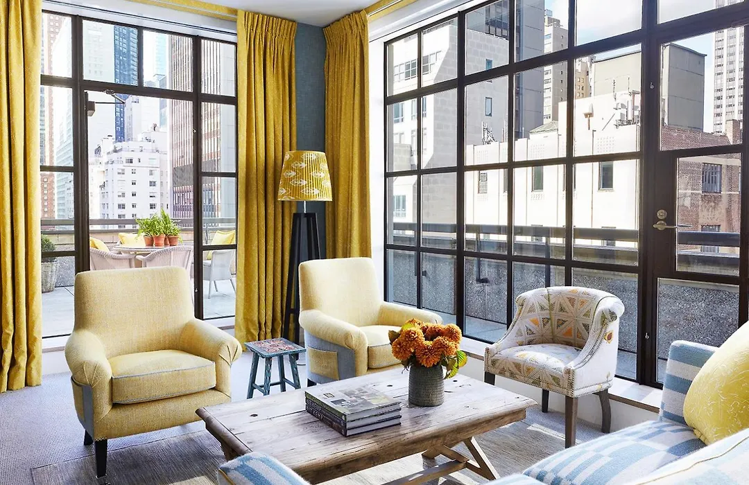 Rooms at The Whitby Hotel are individually designed, featuring high ceilings and large windows. Guests can choose from various suites, some with landscaped private terrace gardens and views of lower Manhattan and the Hudson River.