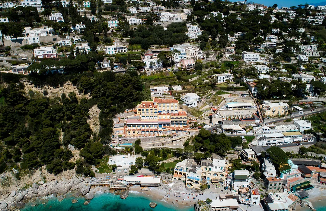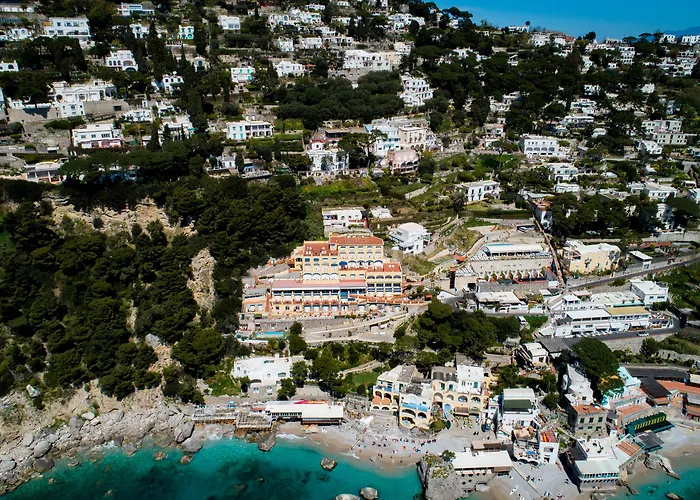Hotel Weber Ambassador, a 4-star Capri hotel rated 8.8/10 on Booking.com, is uniquely situated on Marina Piccola beach, offering direct access to crystal-clear waters and scenic views of the Faraglioni rocks. This location provides an enchanting setting known for its luxurious feel popular among the international jet set.