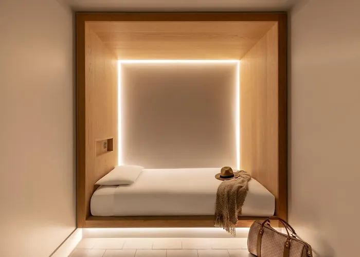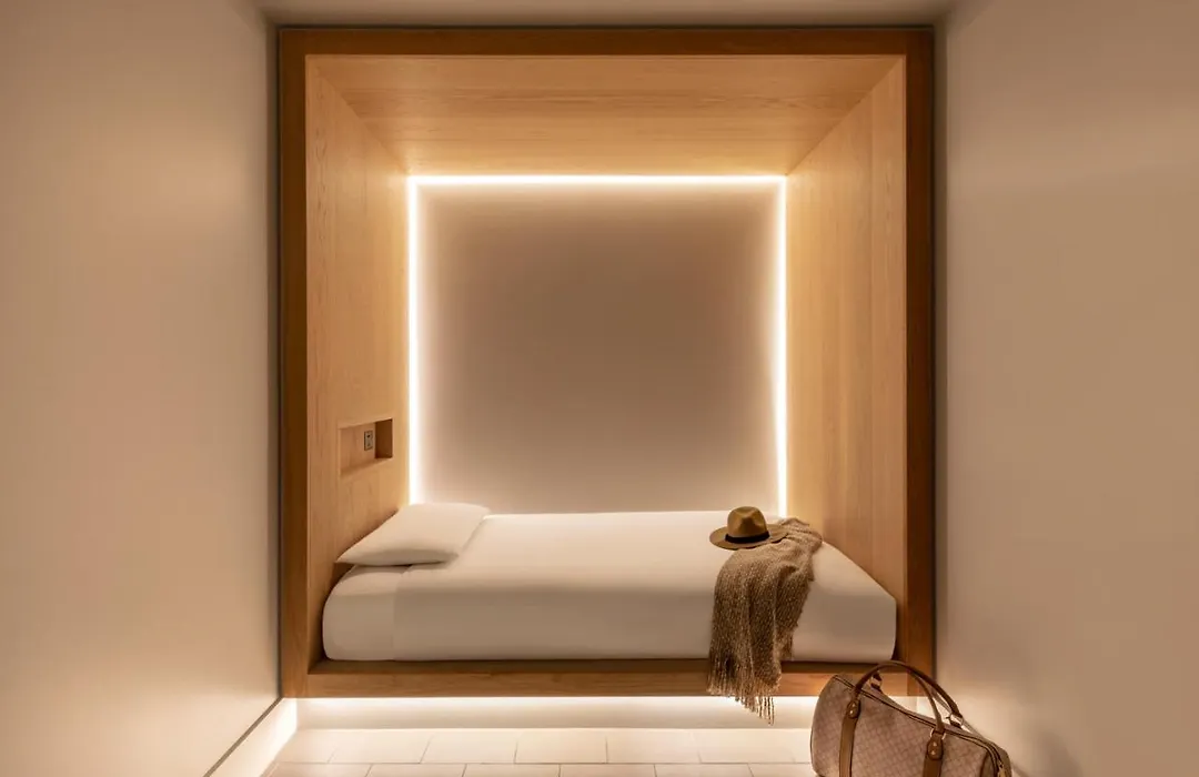 The hotel features capsule cocoons made of natural oak for comfort and relaxation. Each room is windowless, equipped with a Hypnos mattress, Egyptian cotton sheets, and a private bathroom with a walk-in rainfall shower.
