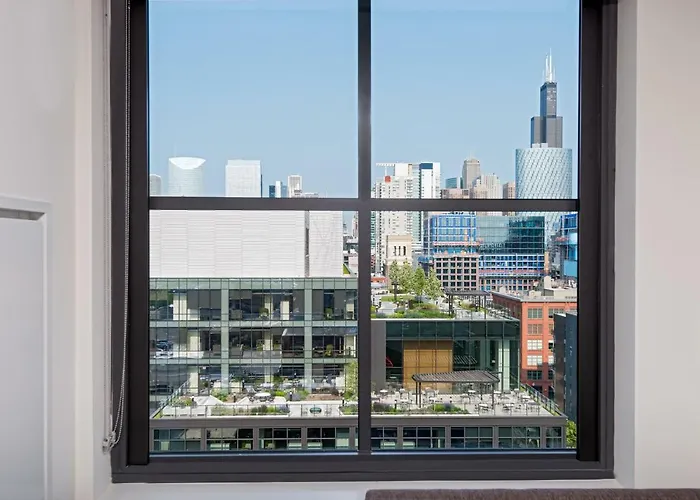 Recreational amenities include a fitness center and an indoor pool. Nearby attractions include the Chicago Riverwalk (1 miles), Union Park (0.5 miles), and the Willis Tower (1.5 miles), offering various entertainment options.