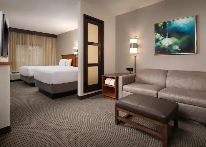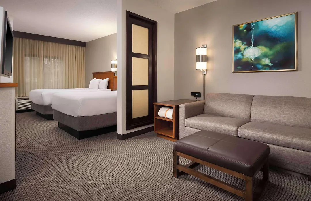 Each guestroom includes a 42-inch high-definition flat panel TV, a signature Hyatt Grand Bed, and a plush Cozy Corner oversized sofa sleeper. Additionally, rooms are equipped with premium bedding and laptop-friendly workspaces.