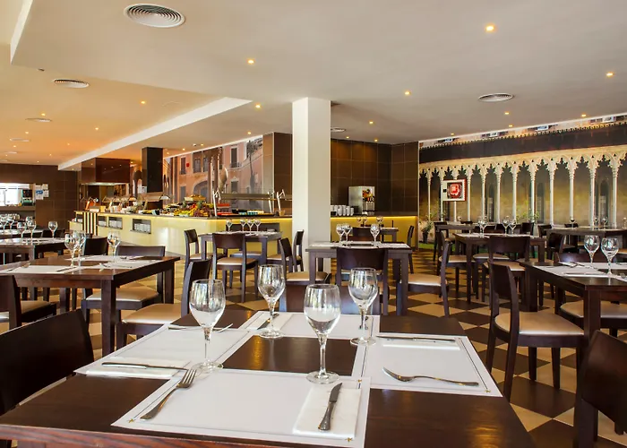 Dining options include the Baleares buffet restaurant serving Mediterranean cuisine, as well as specialty dining at the Beach House and a Mexican restaurant. Guests can enjoy snacks and drinks at various bars within the hotel. An All-Inclusive plan includes three main meals, unlimited snacks, and national drinks.
