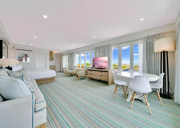 The hotel offers various room types, including the Classic King ADA Studio and the Oceanview King Studio, each equipped with kitchenettes and luxurious bathroom amenities. The Premium King Queen Suite features a separate living room and full kitchen, accommodating larger families comfortably.