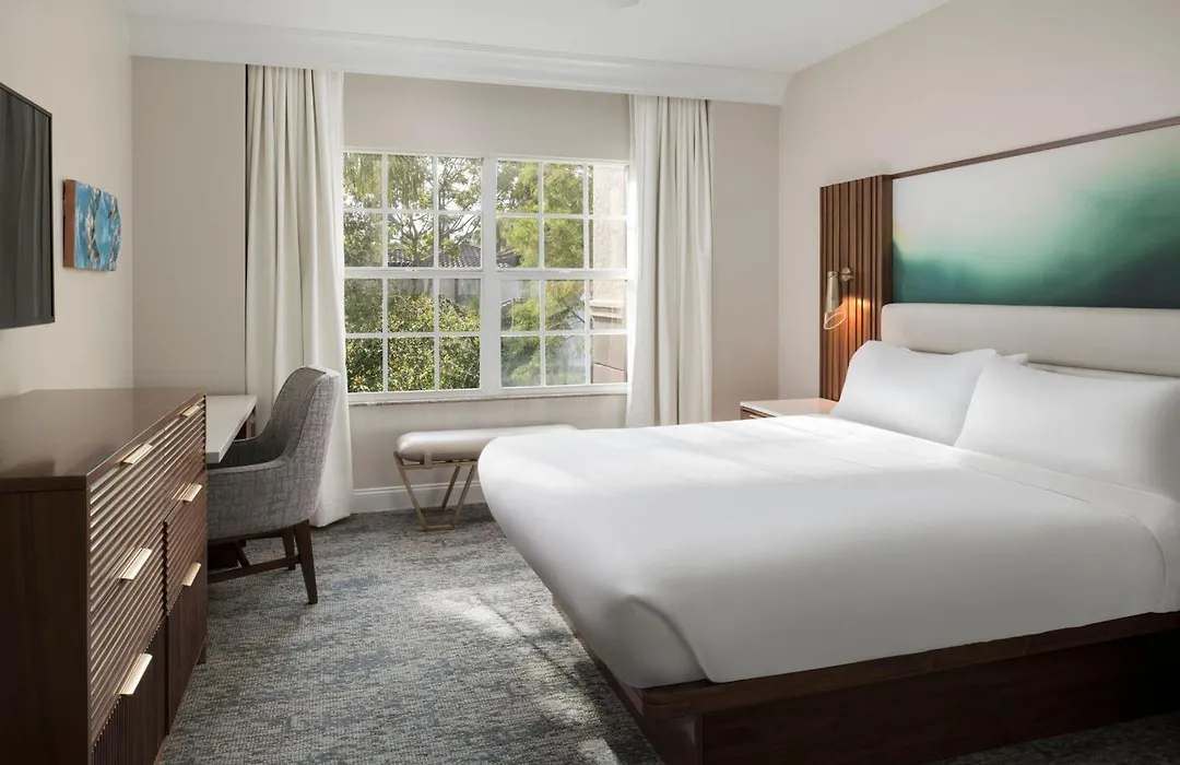 On-site dining options include Blossom's Bar and Grill, serving appetizers and specialty drinks, and The Marketplace, offering grab-and-go snacks and Pizza Cucina with handcrafted pizzas. Guests can also access additional dining venues at the adjacent JW Marriott Orlando, Grande Lakes.