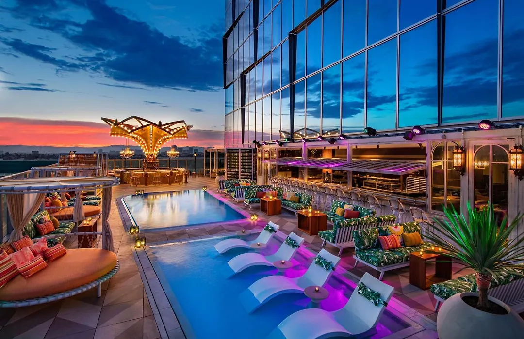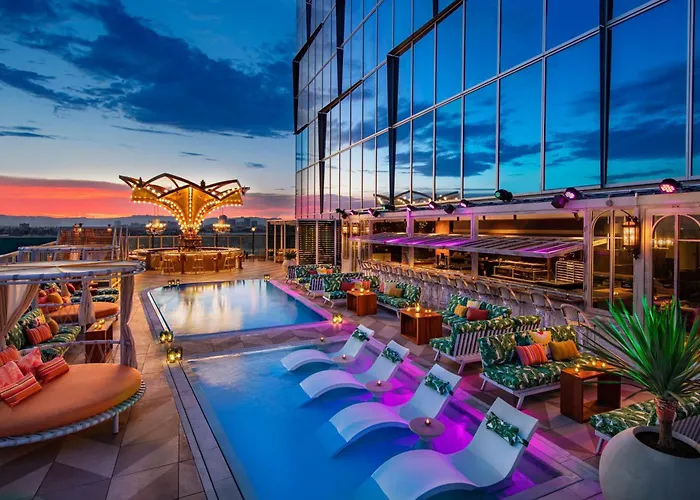 Moxy Downtown Los Angeles, a 4-star hotel with a rating of 7.8/10 on Booking.com, features an outdoor swimming pool, a rooftop bar with views to the Hollywood Hills, and a fitness center. Positioned in the creative epicenter of Los Angeles, it caters to modern travelers with a dynamic selection of dining and leisure options.