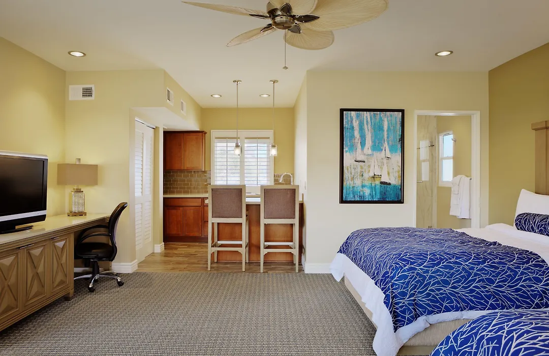 Pacific Shores Inn offers a variety of room types including Standard Rooms with one or two queen-sized beds, featuring a refrigerator, microwave, and flat-screen TV. Deluxe Rooms provide vaulted ceilings and extra space, while Junior Suites come with a well-equipped kitchen and living area.