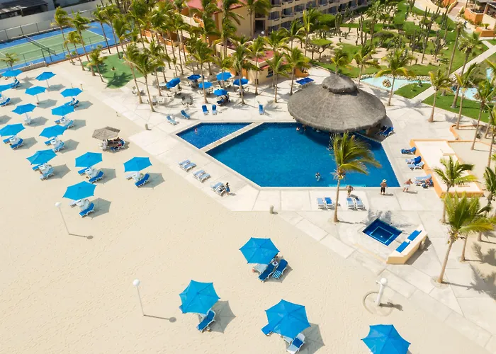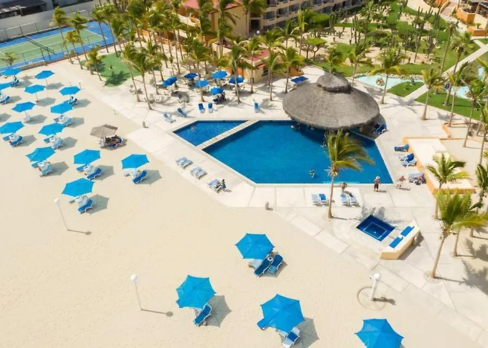 Guests can engage in various leisure activities such as beach volleyball, and utilize the services of an on-site car rental agency and mini market. The hotel features recreational amenities, including a swimming pool and a private beach area with shaded seating.