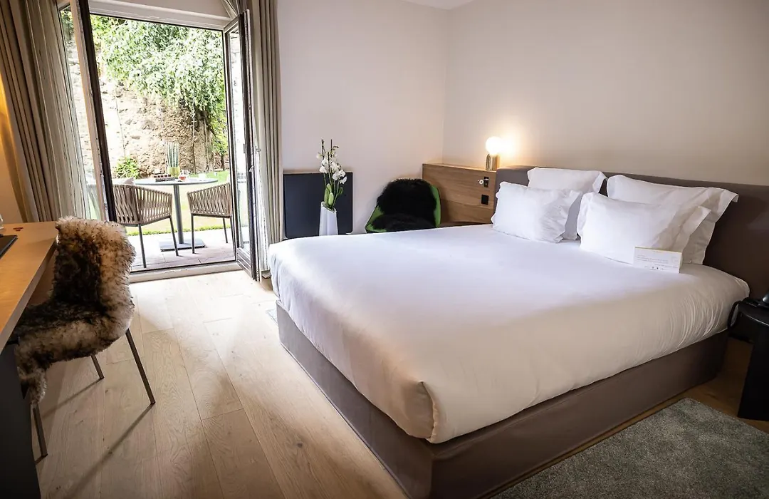 The hotel offers 33 uniquely decorated rooms, including 6 suites, featuring spacious layouts with amenities such as air conditioning, minibars, and flat-screen TVs. Some rooms provide beautiful views of the surrounding vineyards and hillsides, with select accommodations designed for guests with reduced mobility. Guests enjoy complimentary access to the spa area with an overflow pool and wellness facilities.