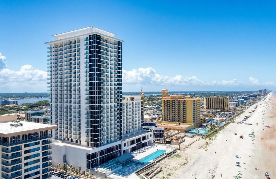 Daytona Grande Oceanfront Resort offers 4-star accommodations with sweeping views of Daytona Beach. Features include a restaurant, outdoor swimming pool, and a bar. The hotel boasts a high rating of 8.9/10 on Booking.com.