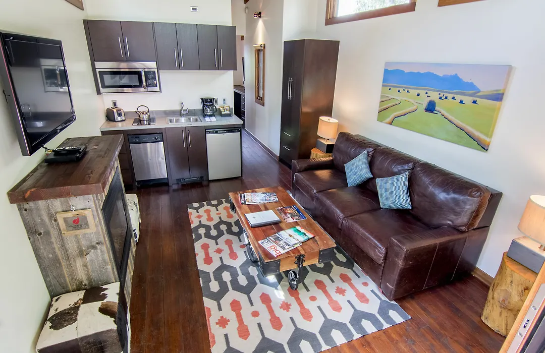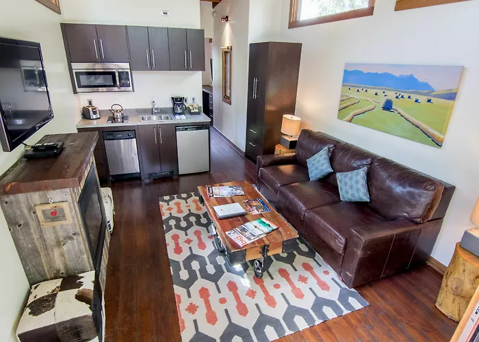 The resort features 23 architectural cabins, each equipped with a fireplace, kitchenette, private deck, and flatscreen TV. Options include Caboose Cabins, which can accommodate up to six guests, making them suitable for families or groups. All cabins have private fire pits for outdoor cozy gatherings.