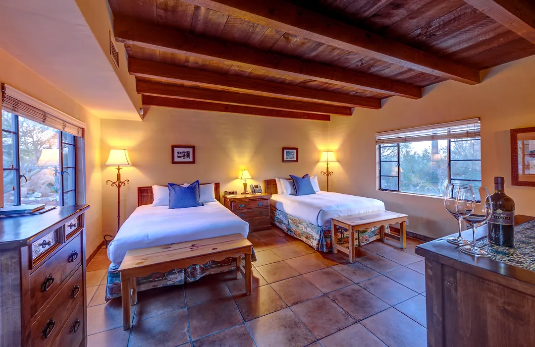 Elegant rooms at Hacienda Del Sol Guest Ranch Resort feature ten-foot ceilings, handcrafted furniture, and private patios. Options include luxurious casitas with outdoor showers and suites with decorative fireplaces. Each accommodation highlights the beauty of the Sonoran Desert with scenic views.