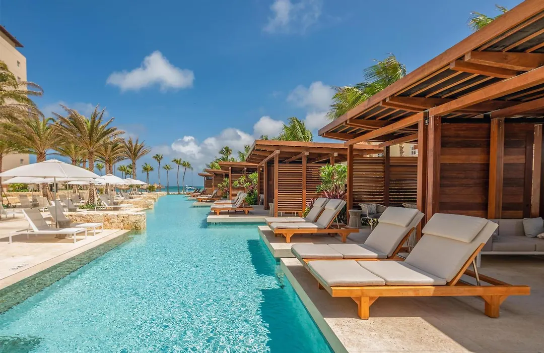 Leisure facilities comprise a signature 8000-square-foot Activity Pool with Aruba's tallest resort waterslide, a fitness center, and tennis courts. The ZoiA Spa offers rejuvenating treatments including massages and facials, complementing the casino for entertainment.